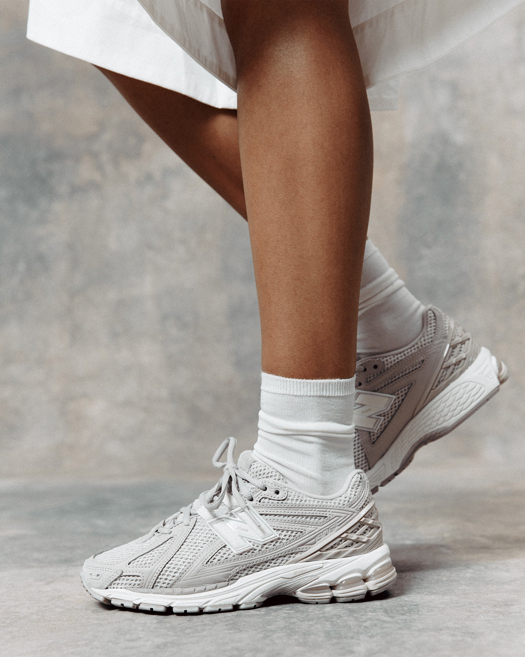 The 1906R, a beacon of elegance and sophistication, emerges from the mist of Grey Days, draped in an exquisite array of soft grey hues. With its intricate layers of suede and nubuck, it speaks to the harmony between nature and craftsmanship. As it glides effortlessly across the marble, each step is cushioned by the full-length ABZORB midsole, propelling us forward with unparalleled energy and resilience.