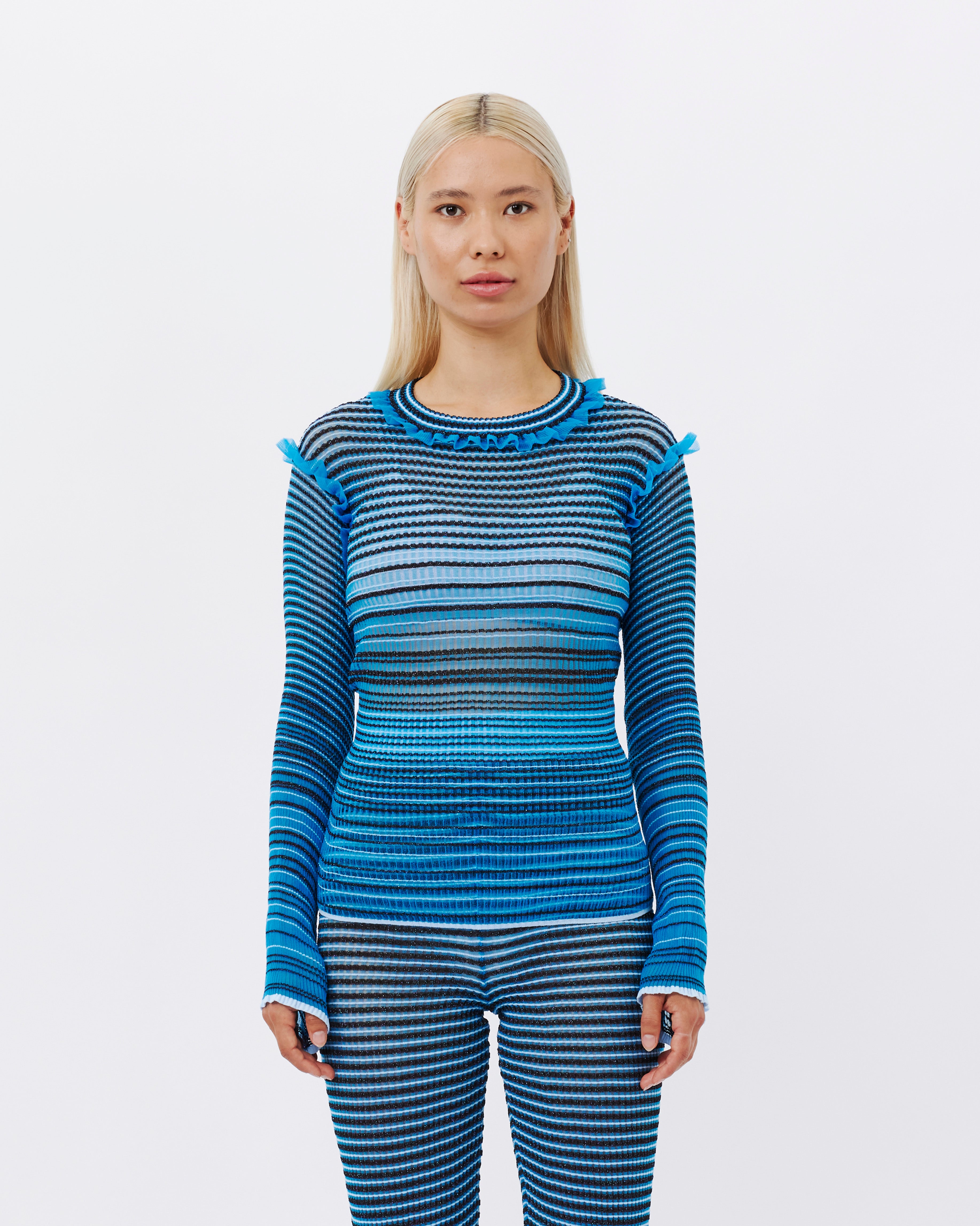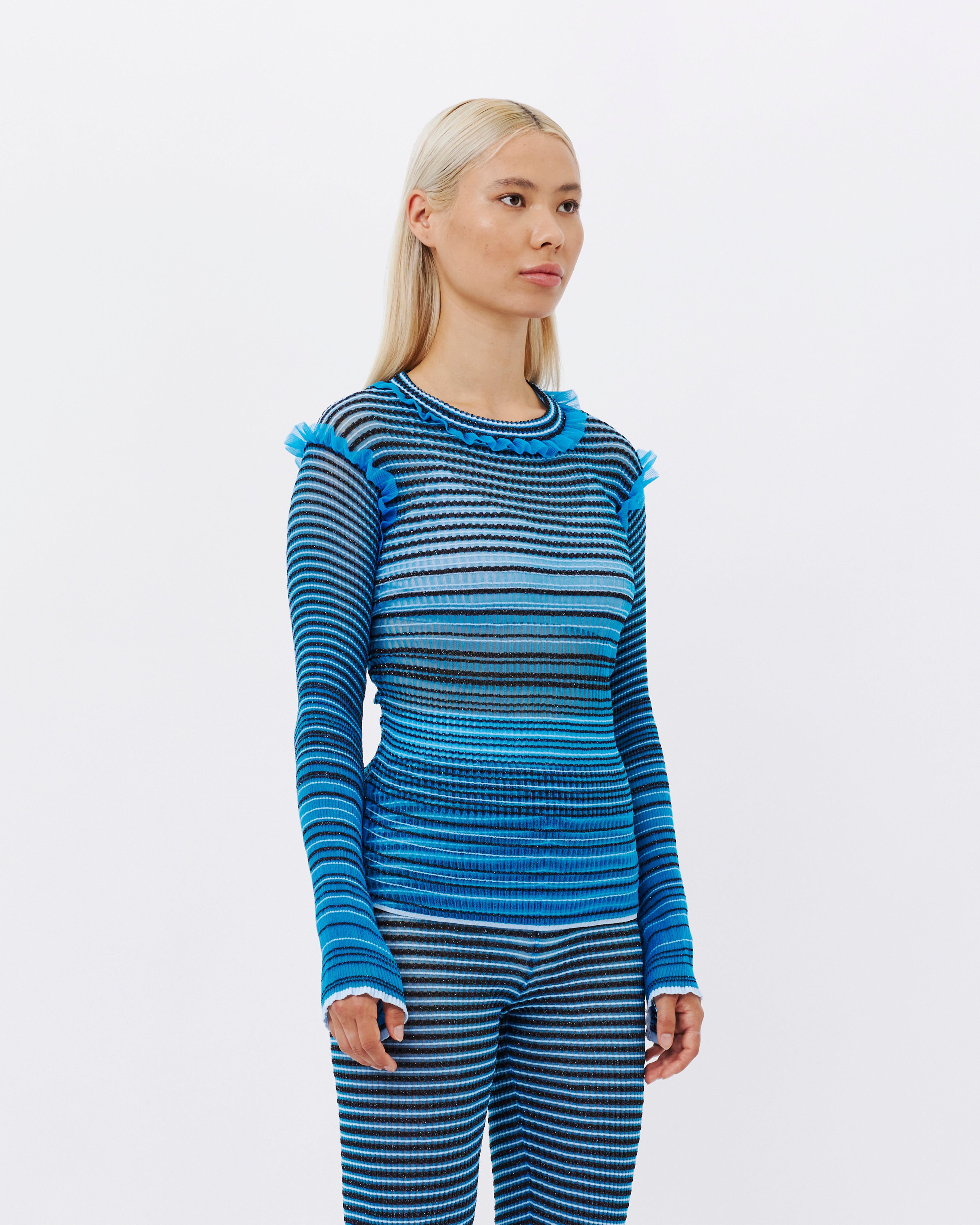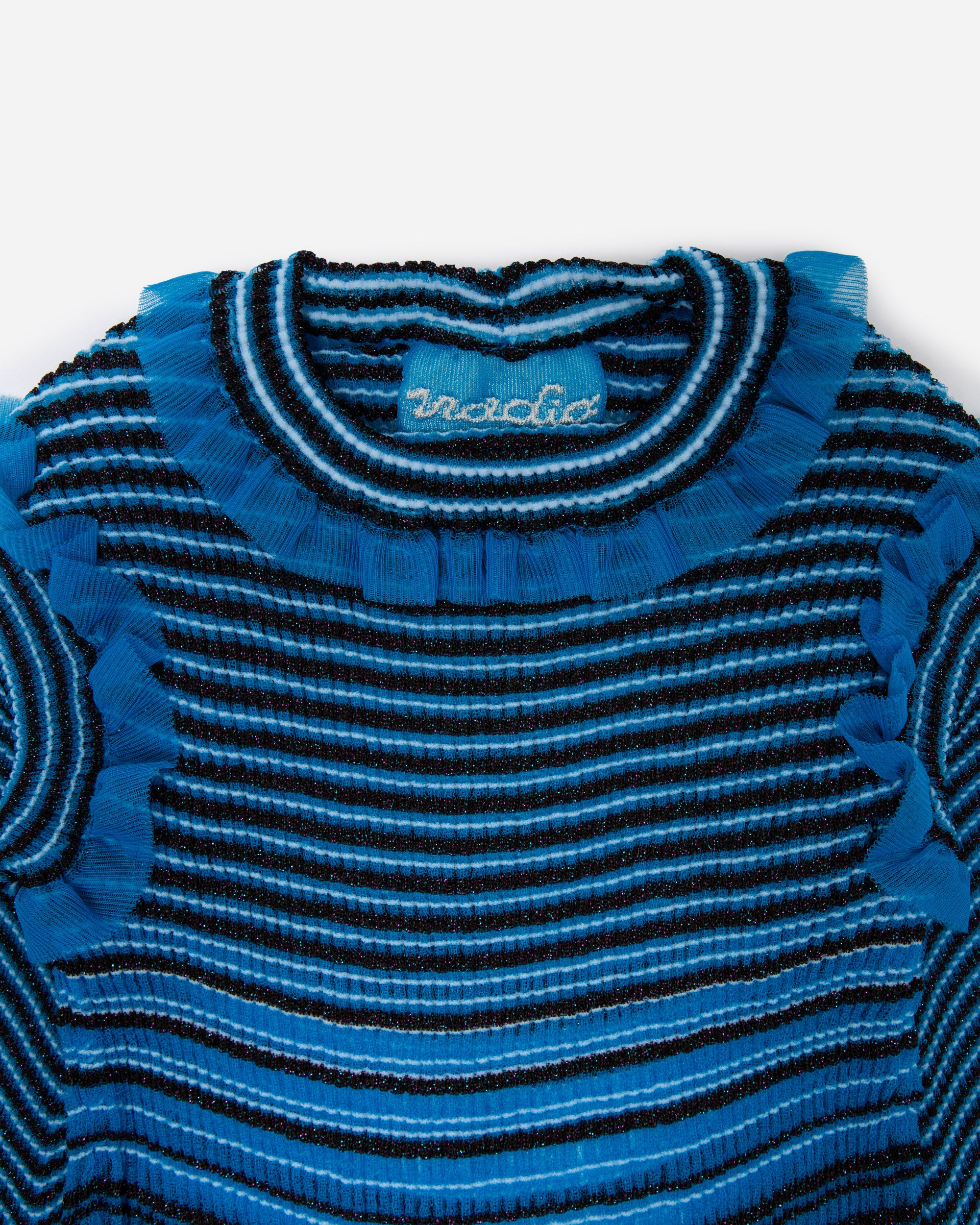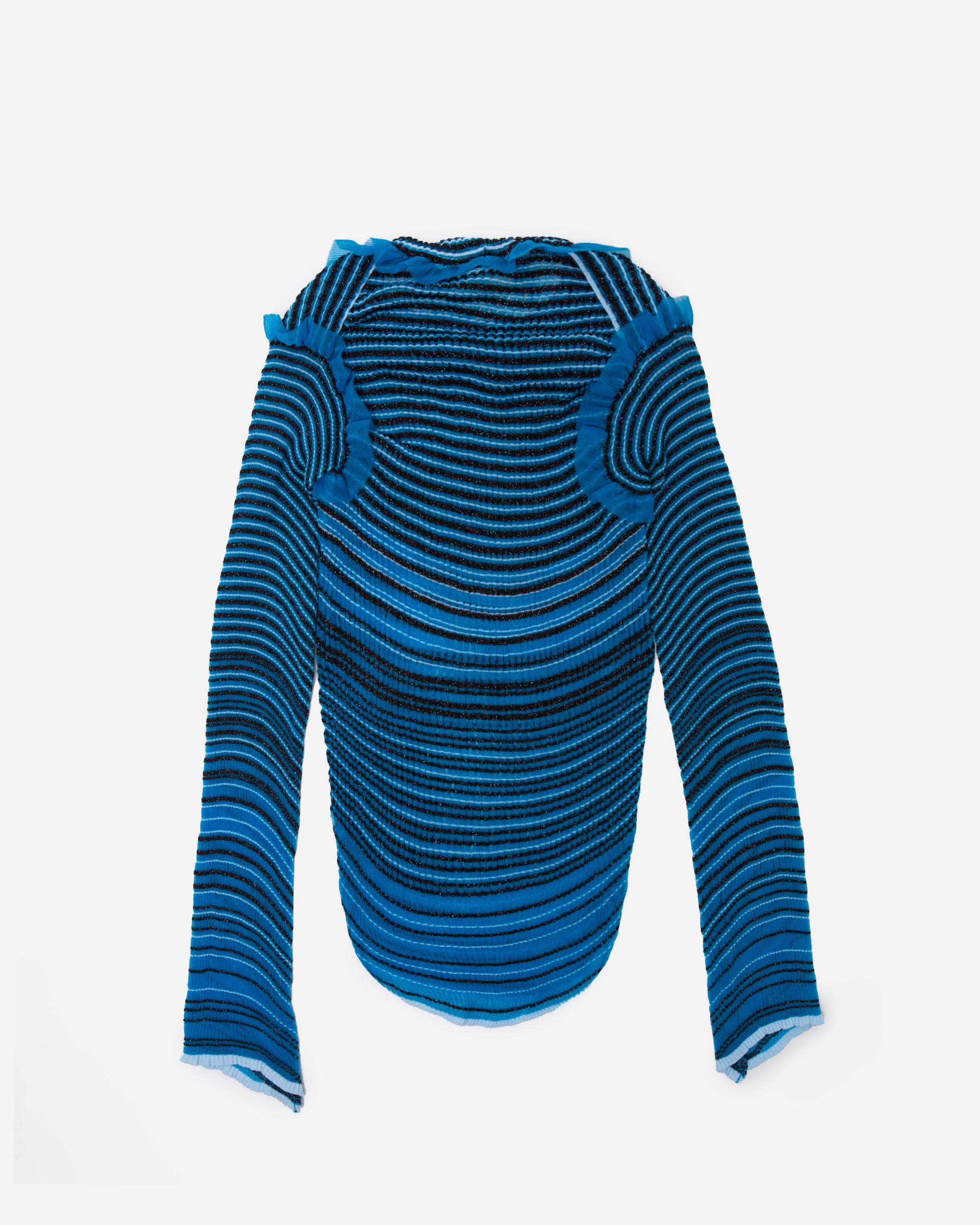 Der von Nadia Wire hier in Kopenhagen auf Bestellung gefertigte Secret Stripes Pullover ist ein transparenter Strickpullover, der durchweg blaue und braune Akzente mit schimmernden Metallic-Details setzt. Rüschendetails schmücken die Ärmel und Schultern, während die leichte, flexible Beschaffenheit des Materials dafür sorgt, dass sich der Pullover an den Körper anpasst.